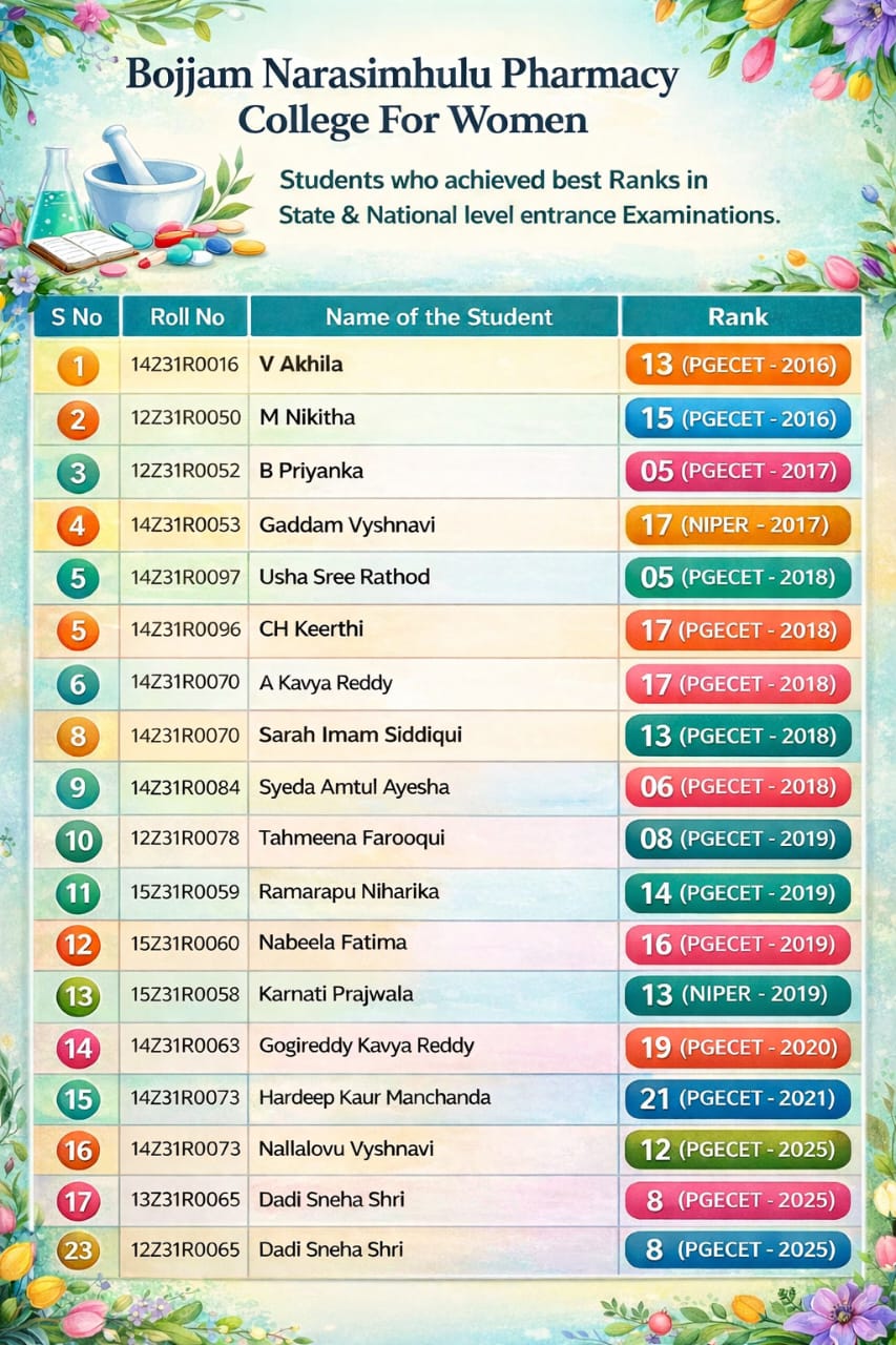At Bojjam Narasimhulu Pharmacy College for Women (BNPCW), we are more than just an academic institution — we are a movement towards women’s empowerment through quality education in pharmaceutical sciences. Here’s why students choose us: